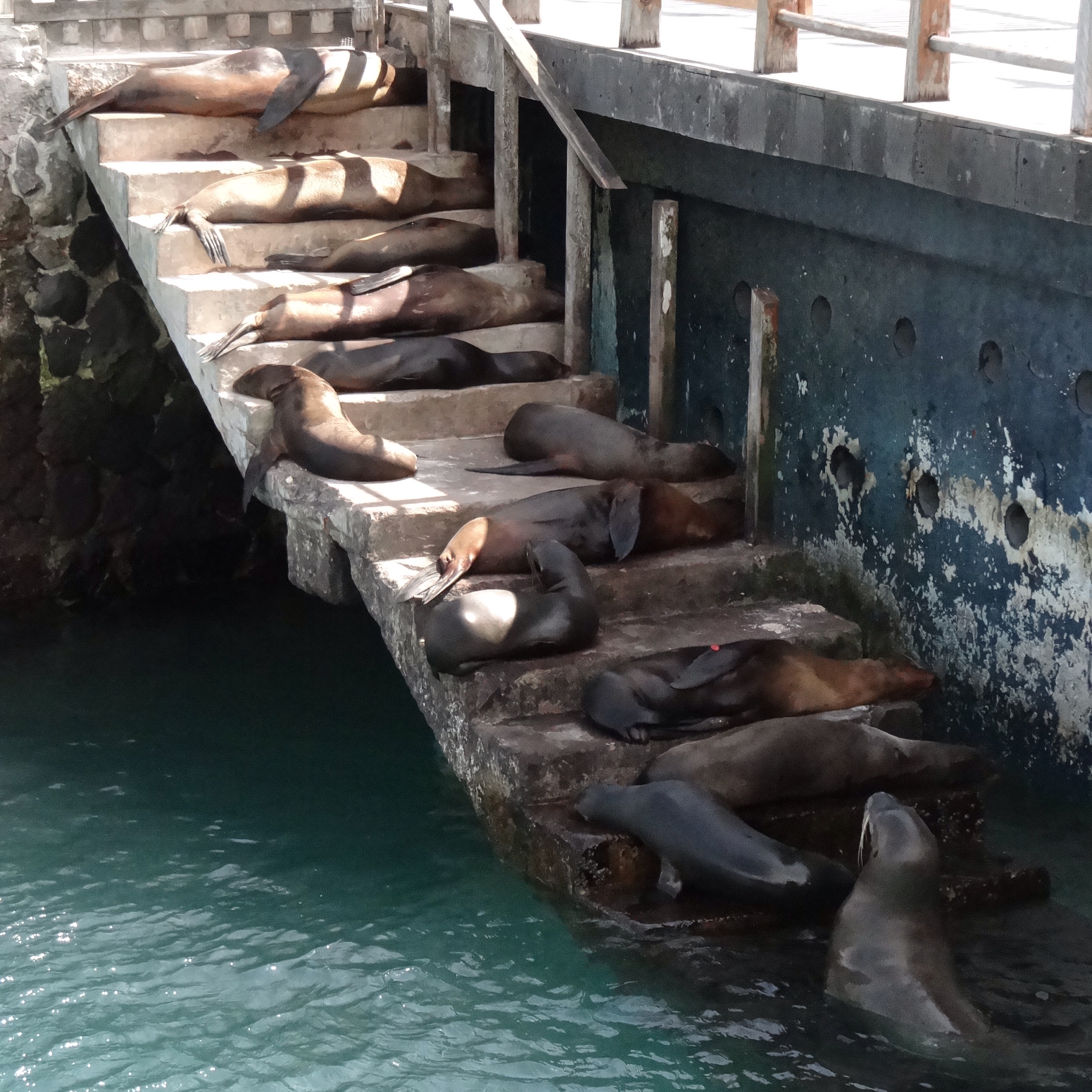 Es esta simbiosis entre el hombre y los animales lo que más me ha sorprendido en mi visita a las islas Galapagos: los animales campan a sus anchas y, sorprendentemente, el hombre les respeta….¿donde si no los leones marinos podrían echarse una siesta en mitad de las escaleras del puerto sin que nadie les moleste?