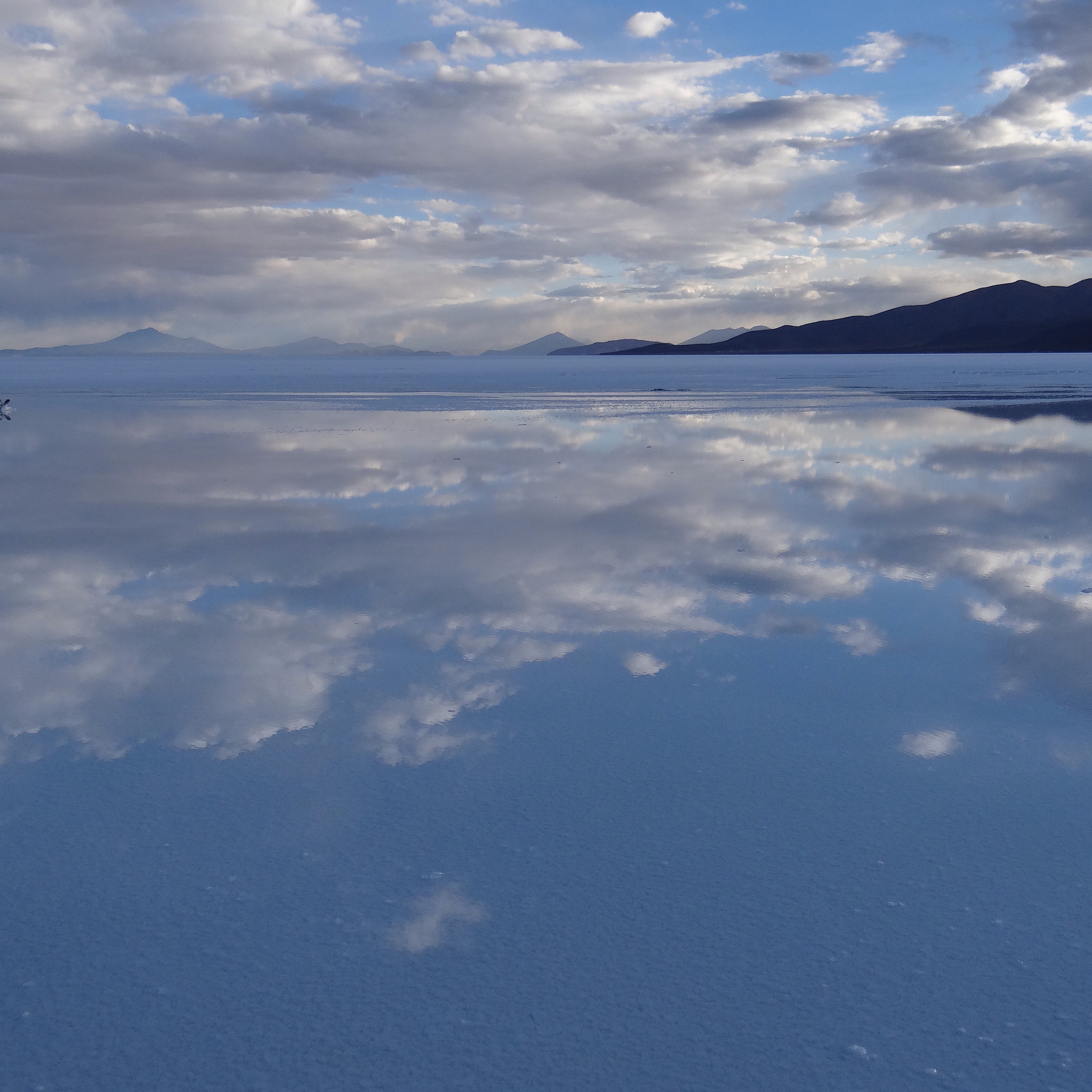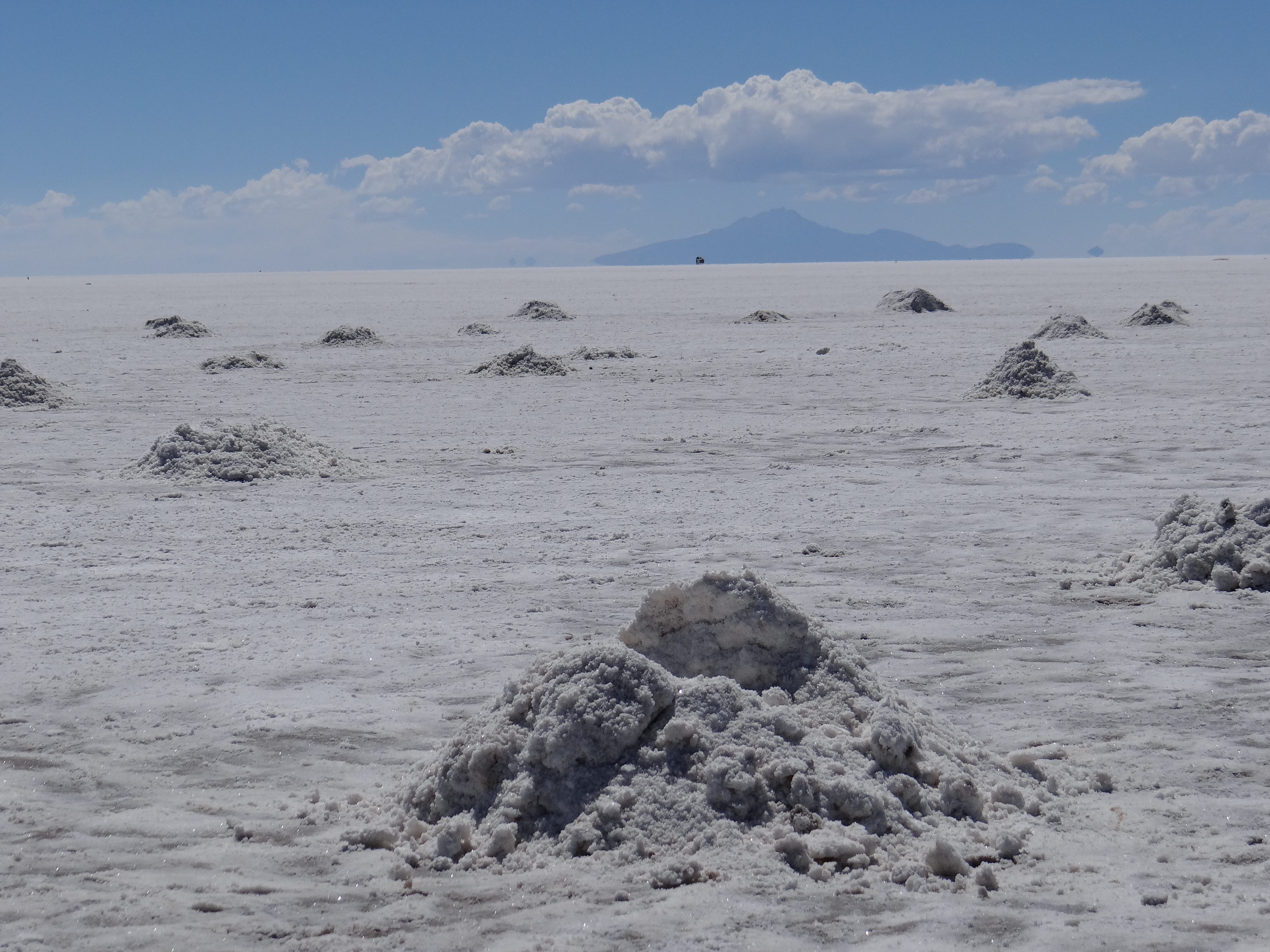Una oceano blanco inmenso se abre antes nuestros pies, sólo interrumpido por pequeñas olas hechas a base de montículos de sal. Es tan vasto que practicamente arrincona a las pobres montañas de alrededor que no se atreven a atravesarlo…