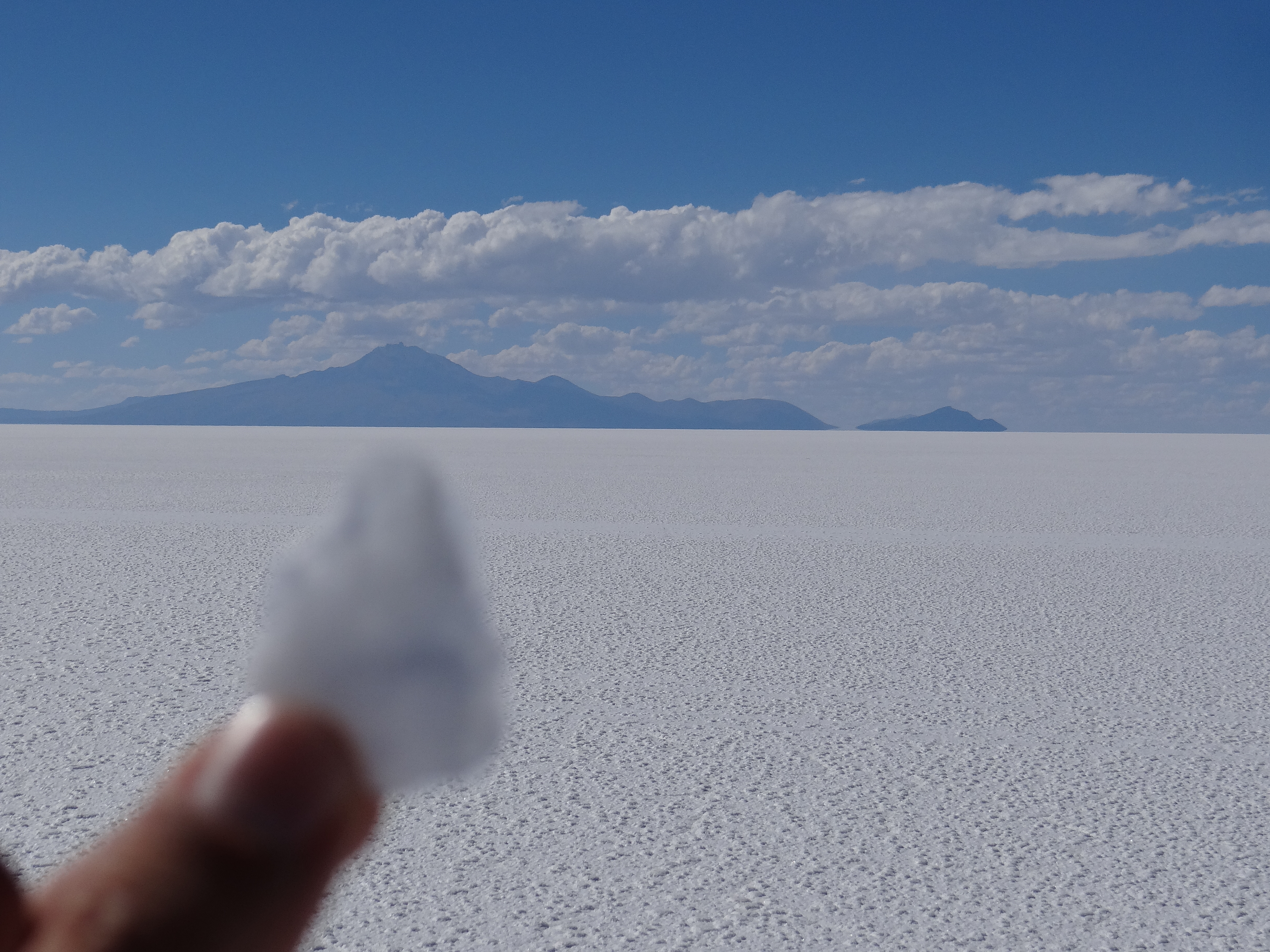 Un fino cristal de sal , tan frágil que se parte en cuanto lo dejo en el suelo otra vez. Millones de estos , comprimidos contra el suelo , forman la superficie del salar. El suelo cruje bajo nuestros pies como si caminaramos sobre corn flakes o algo así…