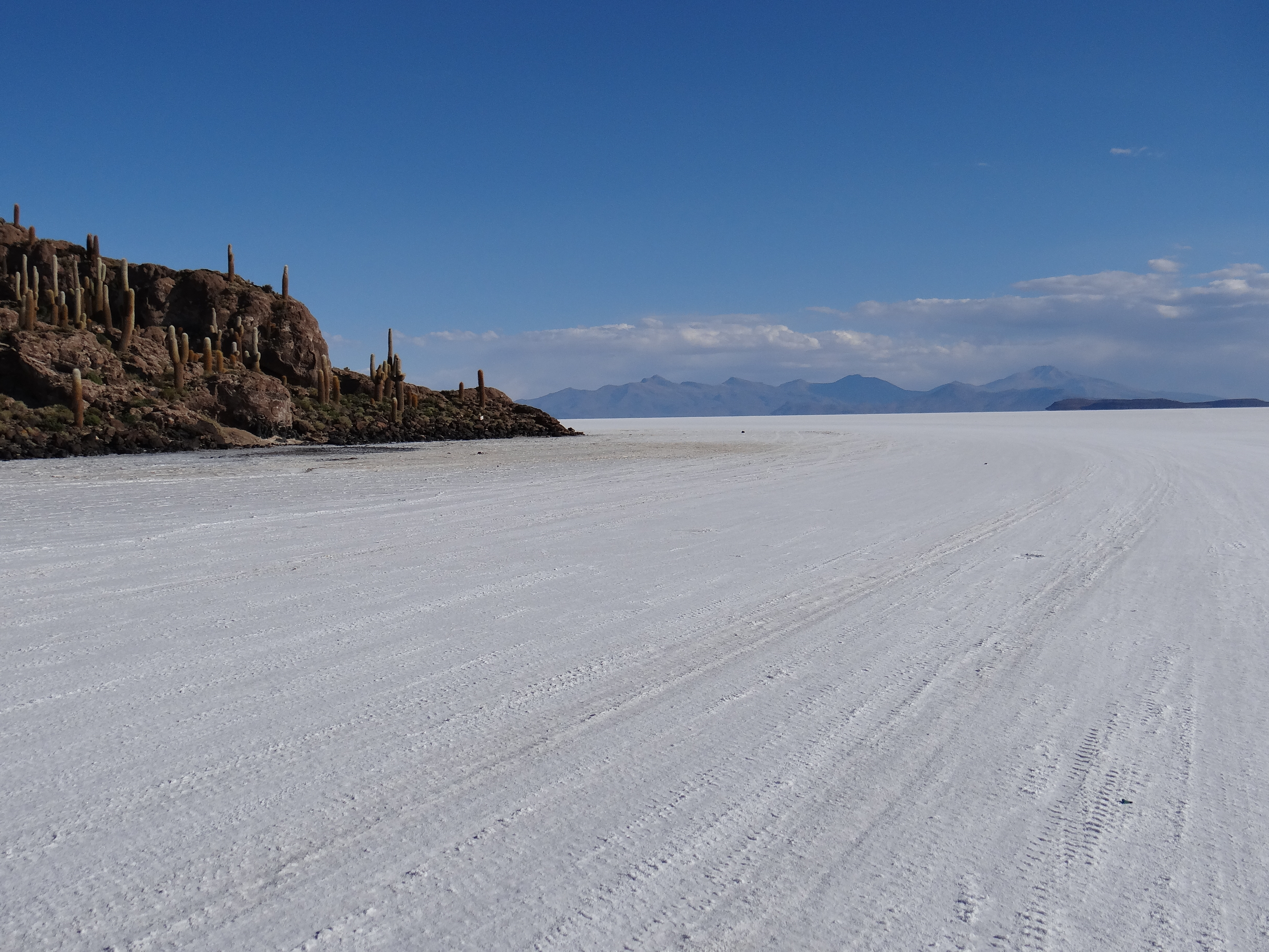En medio del horizonte blanco despunta un asomo de vida : la isla de Incahuasi