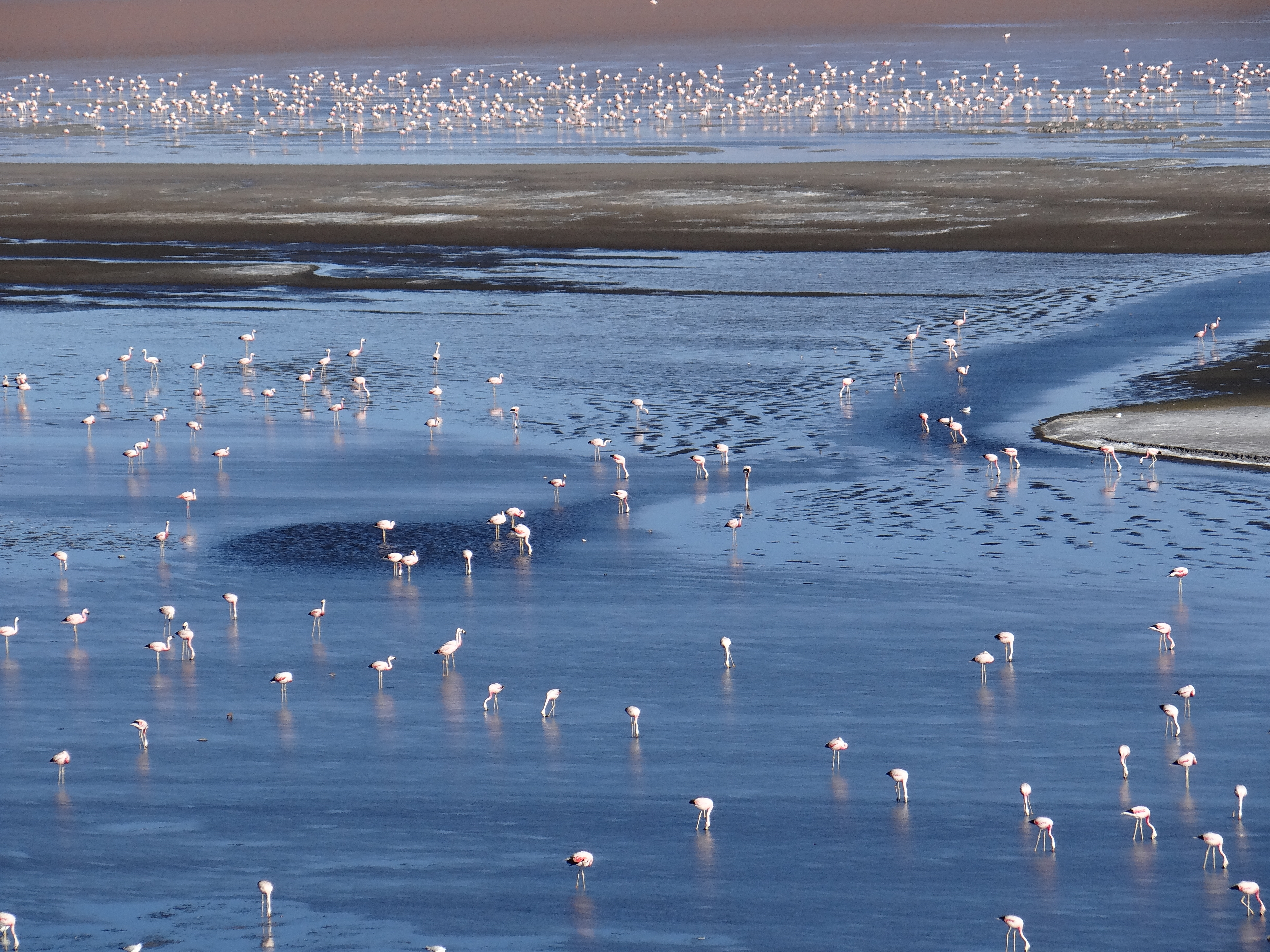 Más lagunas y con más colores : la Laguna Colorada (debido a unas algas que crecen allí) no siempre se muestra con tal color – mejor por la mañana sobre las 11:00 – pero eso no aparece importarle a las tres especies de flamenco que anidan allí ; desde el Mirador de Aguas Calientes se aprecia la enormidad de su número