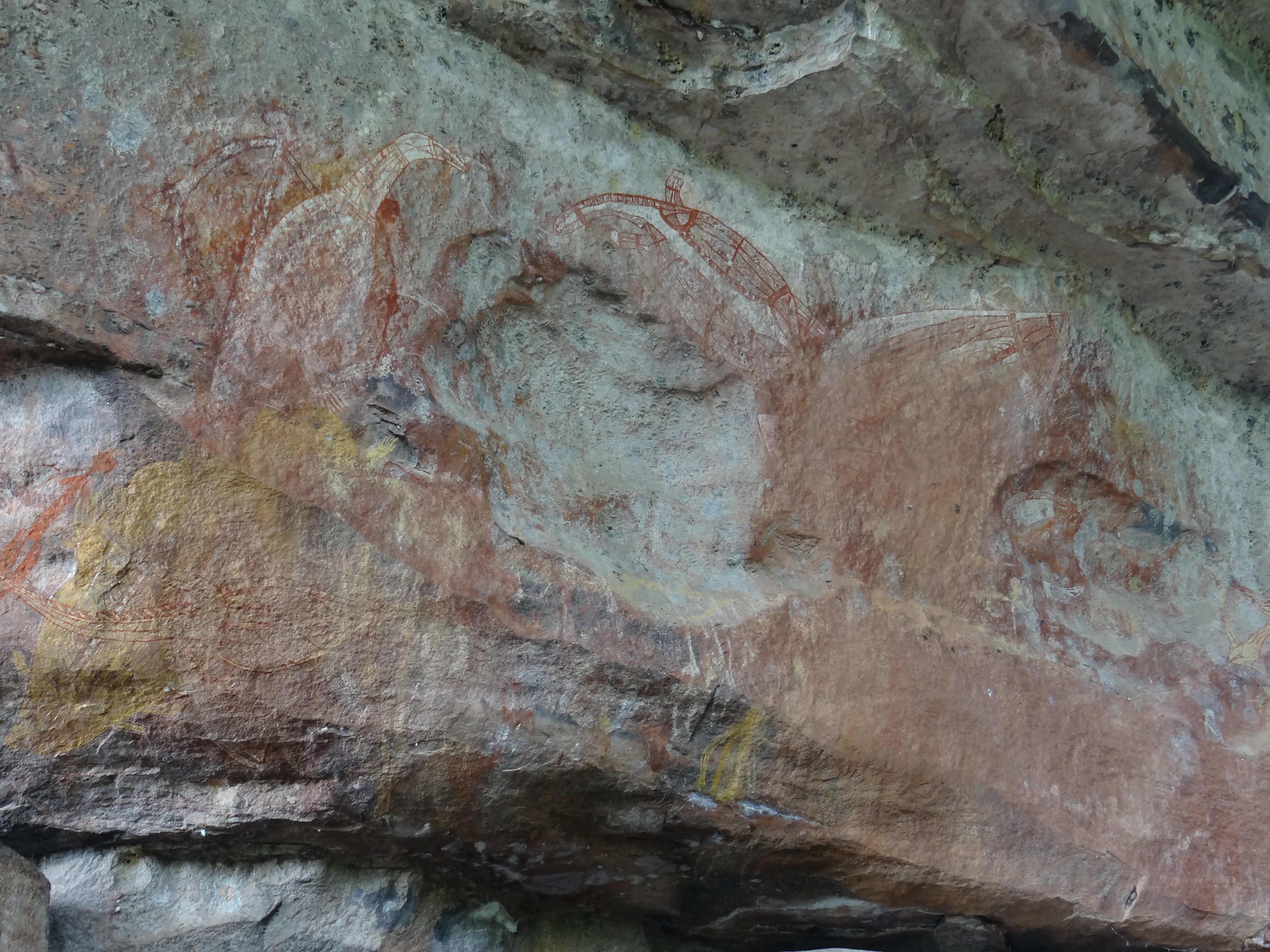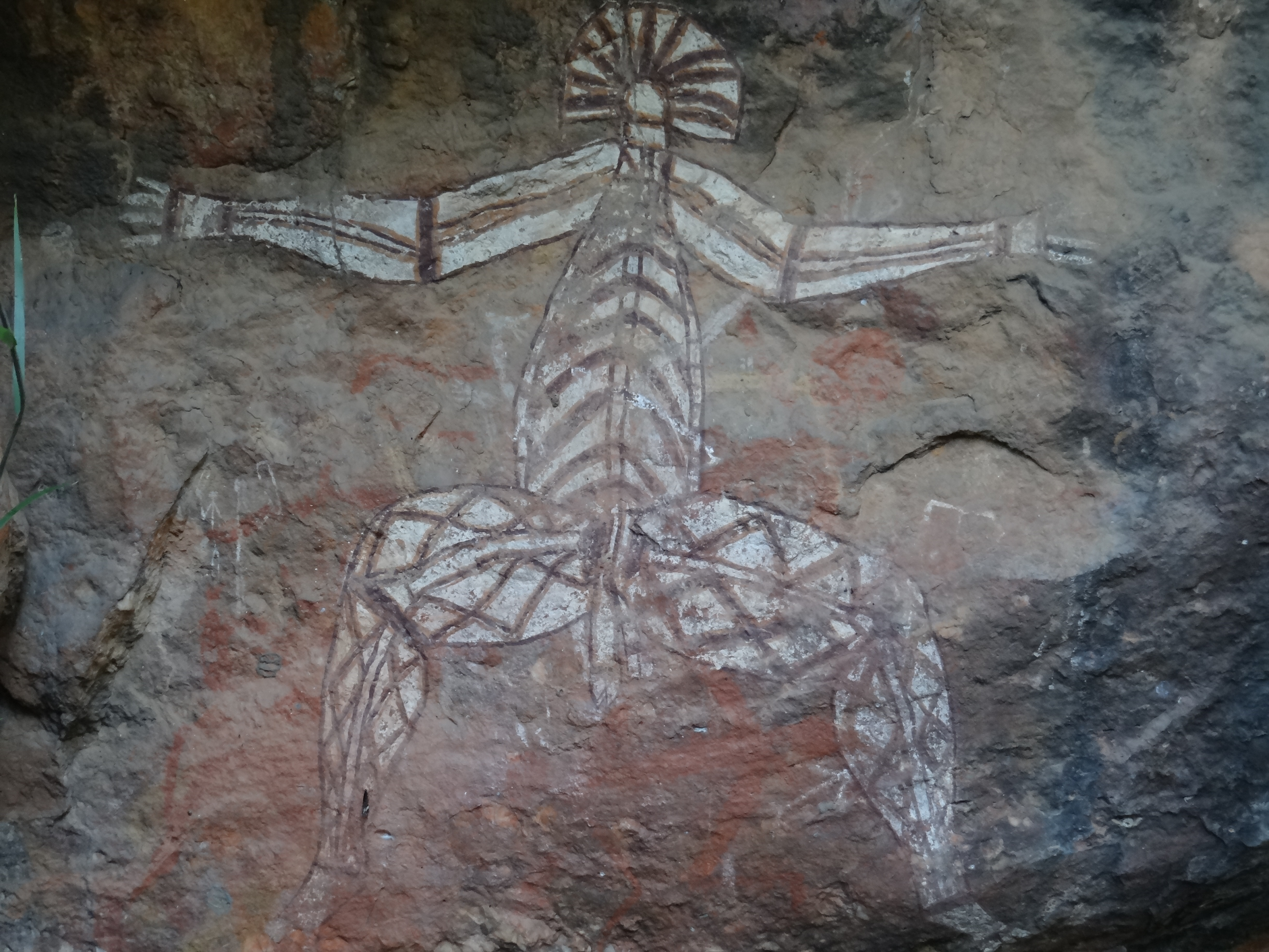 Esa figura de arriba tiene el impronunciable nombre de Nawulwinjbulwinj. Los aborígenes tenía la costumbre de secuestrar a las mujeres de otras tribus si las sorprendían alejadas de su campamento así que se inventaron la leyenda de este ser que golpea a las mujeres si se alejan de casa como medio de aleccionarlas para que no caminaran lejos de su campamento