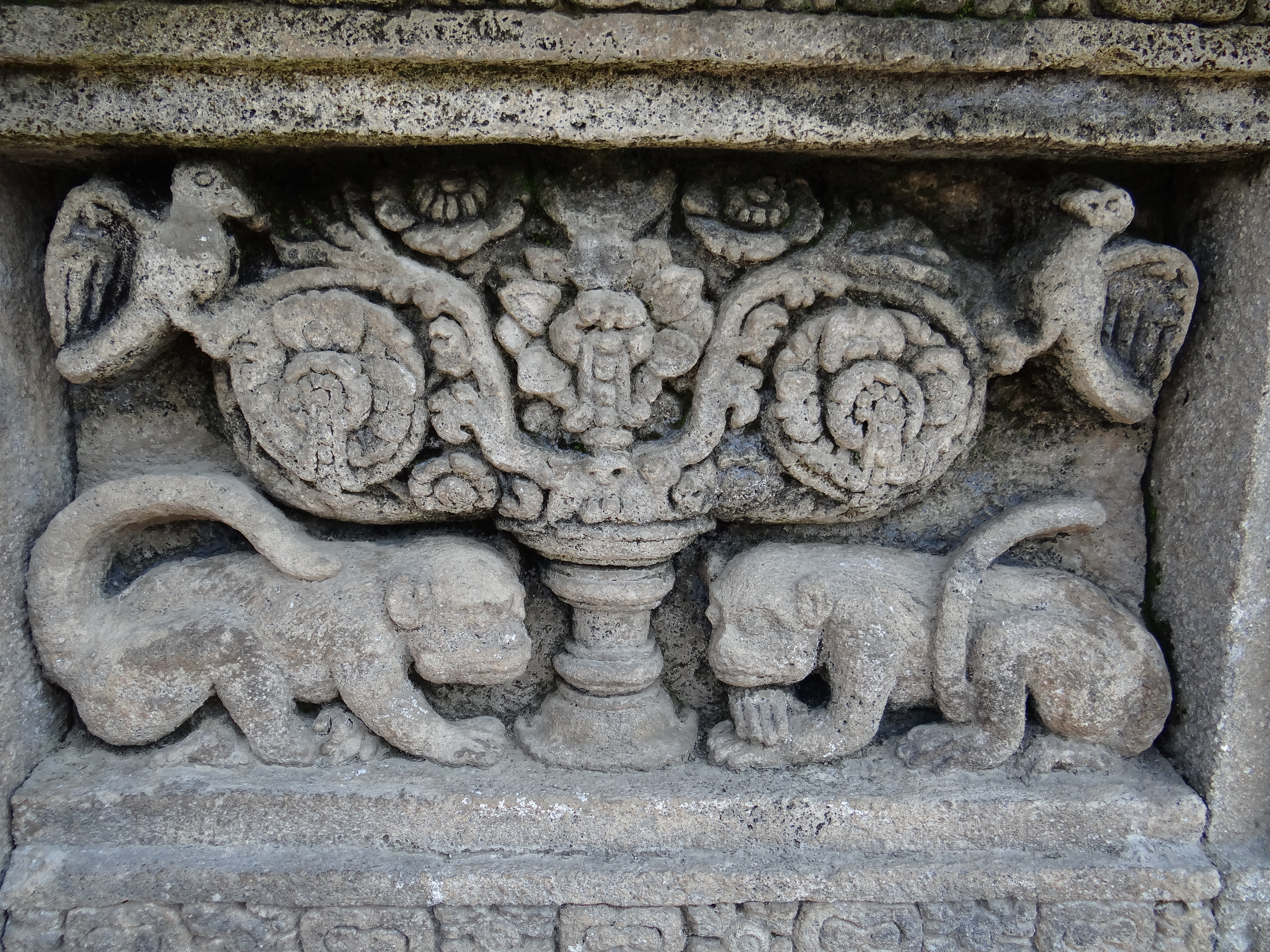 Su torre principal esta flanqueada por otras más pequeñas , secundarias , y tiene un patrón muy definido: en el piso inferior escenas de distintos animales: monos, palomas etc